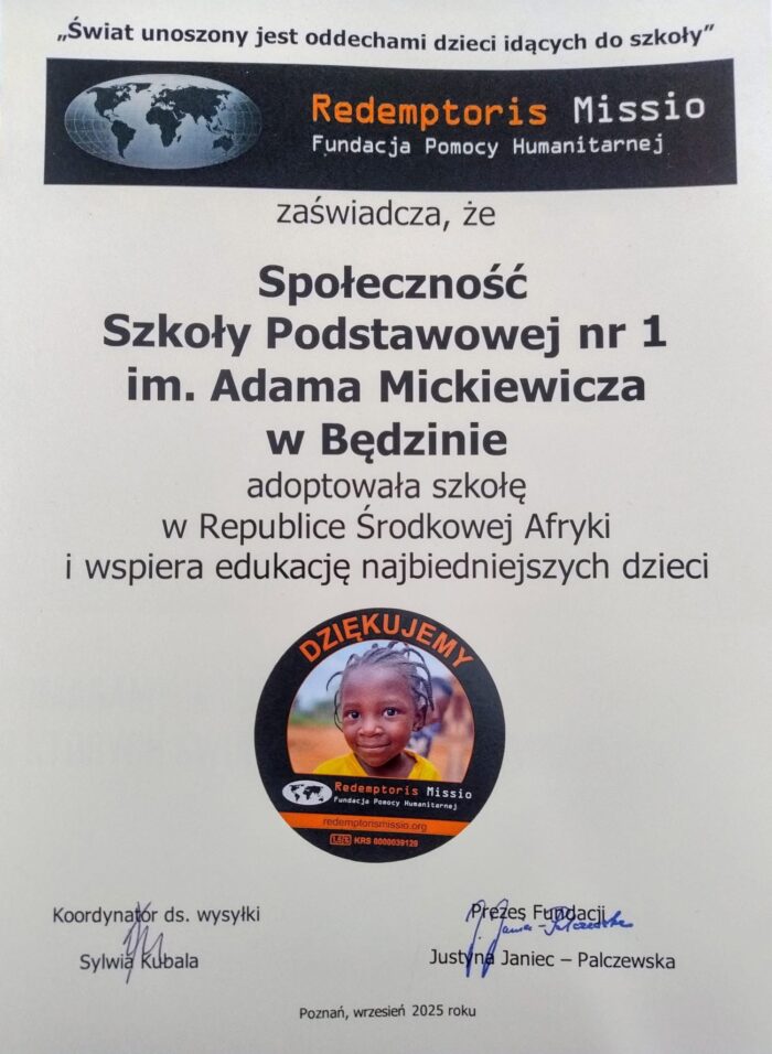 Nasza szkoła z zaangażowaniem włączyła się w inicjatywę adopcji szkoły w Republice Środkowej Afryki, której celem jest wsparcie edukacji najbiedniejszych dzieci w jednym z najuboższych krajów świata.