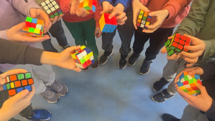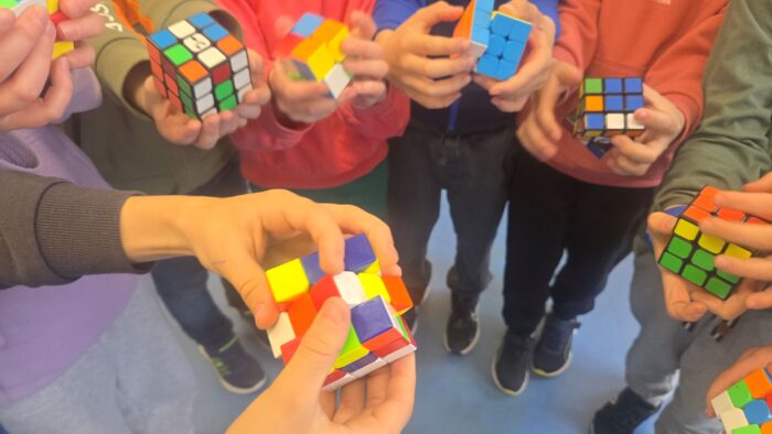 17. kwietnia obchodziliśmy Światowy Dzień Kostki Rubika, który spotkał się z dużym zainteresowaniem uczniów. Dzieci z klas I–III przyniosły do szkoły swoje kostki Rubika i chętnie wykorzystywały przerwy międzylekcyjne do wspólnej zabawy oraz prób układania kolorowych ścianek. Wydarzenie sprzyjało integracji uczniów, rozwijaniu cierpliwości, koncentracji oraz logicznego myślenia, a jednocześnie stało się okazją do wspólnej, aktywnej i twórczej zabawy w szkolnej przestrzeni.