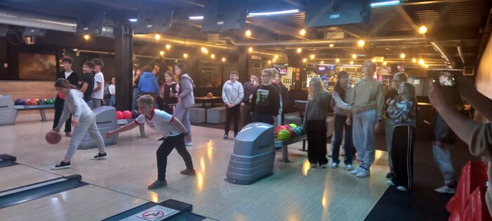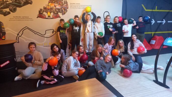 Po przybyciu na miejsce uczniowie podzielili się na drużyny i rozpoczęli emocjonujące rozgrywki. Było dużo śmiechu, rywalizacji i… kilka efektownych strike’ów!