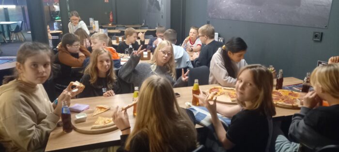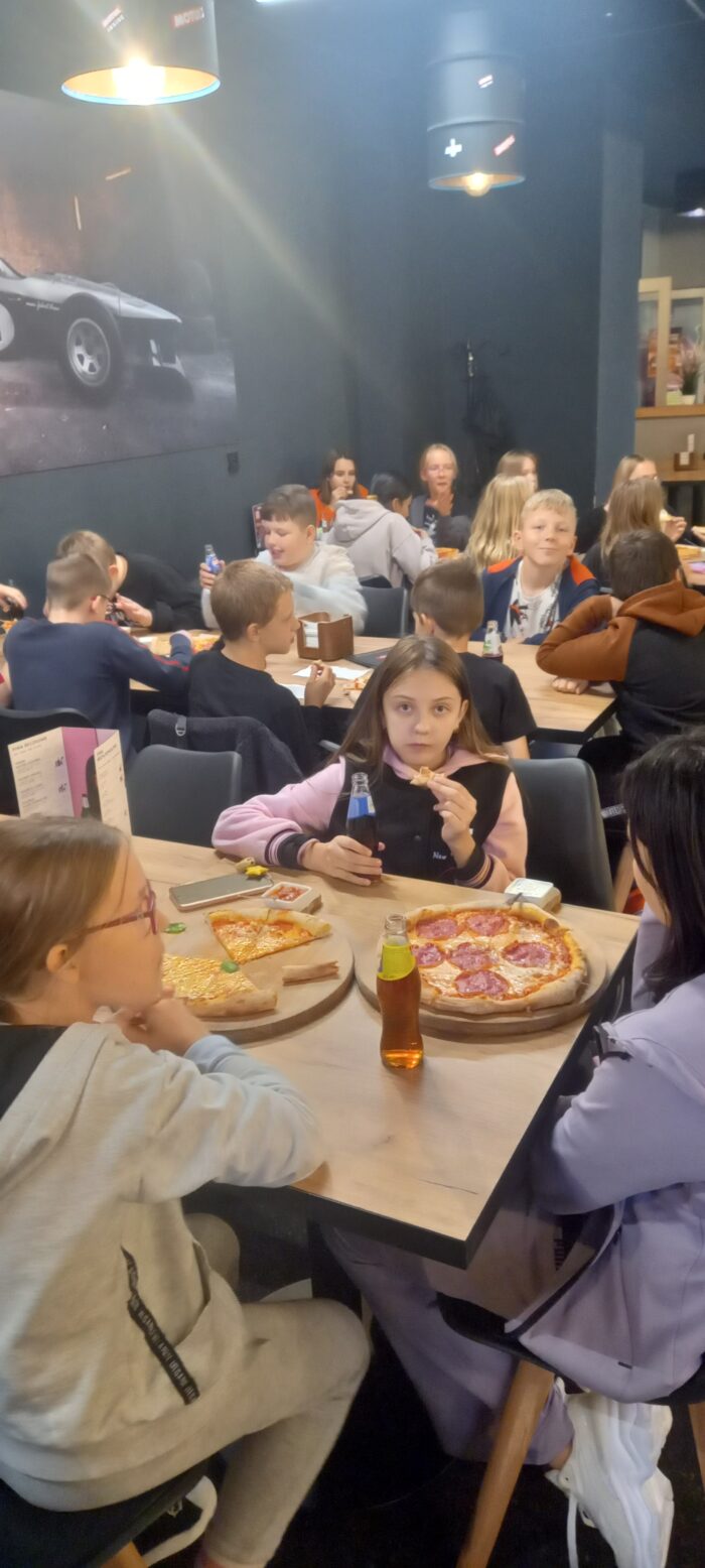 Po sportowych zmaganiach nadszedł czas na odpoczynek – cała klasa przy wspólnym stole częstowała się pyszną pizzą.